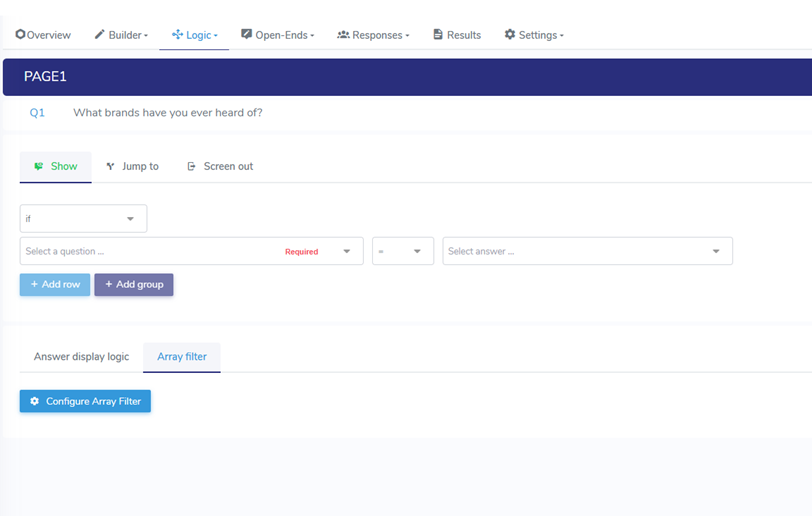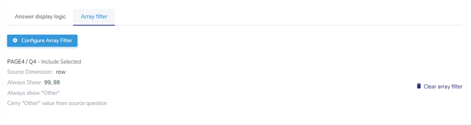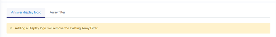 Please note that once an Array Filter is applied to a question, it is no longer possible to add Display Logic, and vice versa. A single question can contain only one type of option display configuration — either Display Logic or an Array Filter.