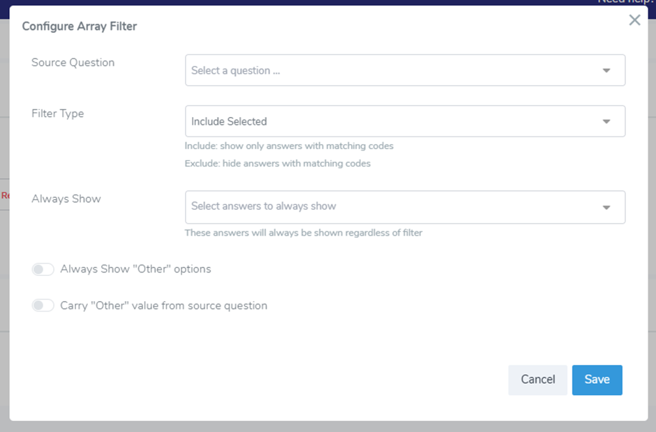 Toggle “Carry “Other” value from source question” – when enabled this will carry the “other” value respondent entered in the source question to another question with an array filter. Important to remember, that currently this will work only on questions that can have “other” options, so it will not work on matrices.