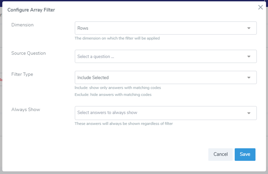 Source Dimension – determine which dimension codes of the source question (row or column) will be used for code matching to the question you add array filter to.
