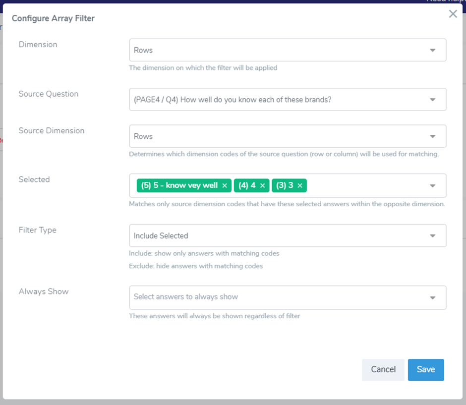Always show – select codes from your question that should always be shown in the question that has an array filter. This could be used if you have one or multiple brands that you need to show in all questions, for the “exclusive” option or anything else that your research goals ask for.