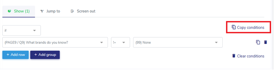 On the right-hand side of the Conditions panel, the “Copy Conditions” button enables copying question-level conditions from one question to any subsequent question within the survey.