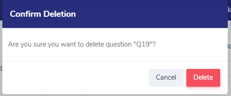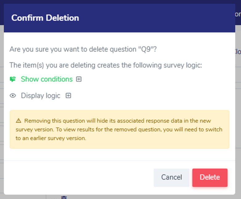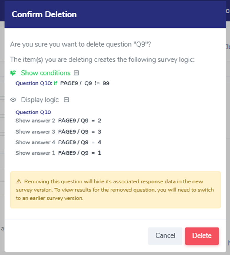 - If deleting a page, question, or answer option affects conditions applied to subsequent questions, the confirmation dialog is displaying a list of the conditions that will also be removed as a result of the deletion.