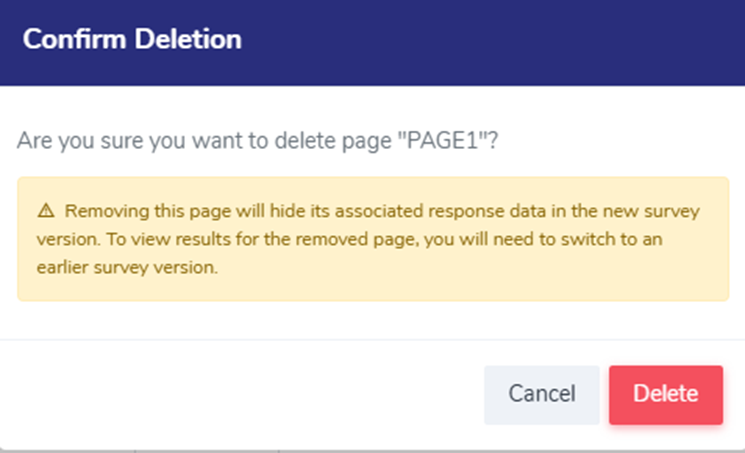 - If a page, question, answer option, or condition is deleted in a survey that already has live completes, a warning message is displayed.