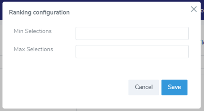 For Ranking questions, it is possible to configure the minimum (MIN) and maximum (MAX) number of selections to be ranked. These values determine how many answer options the respondent must rank.